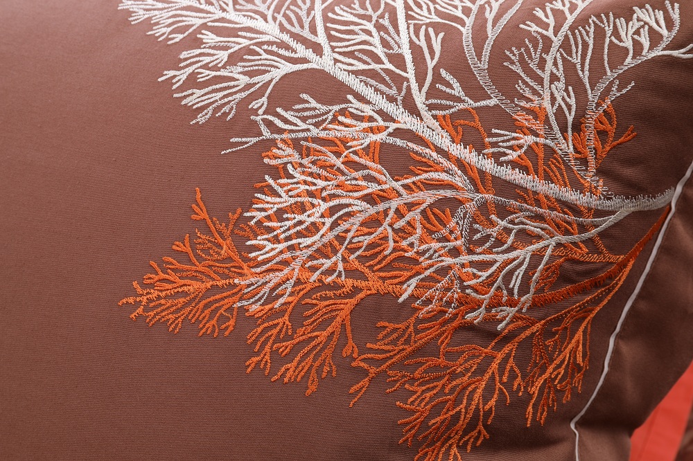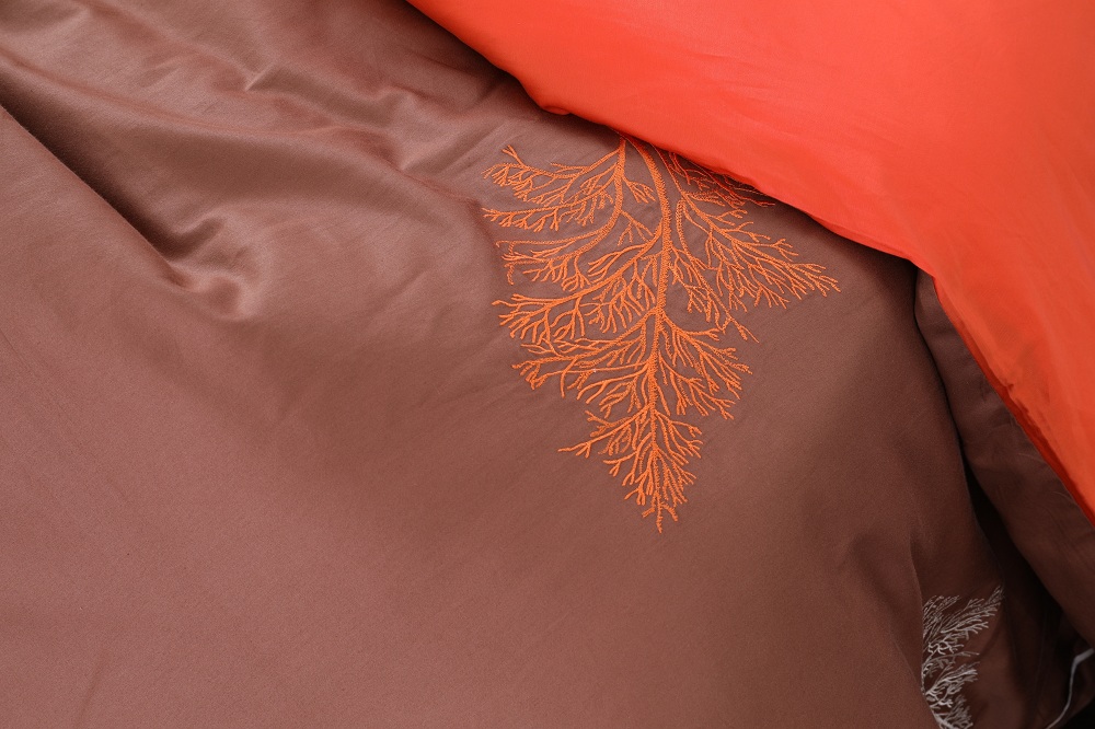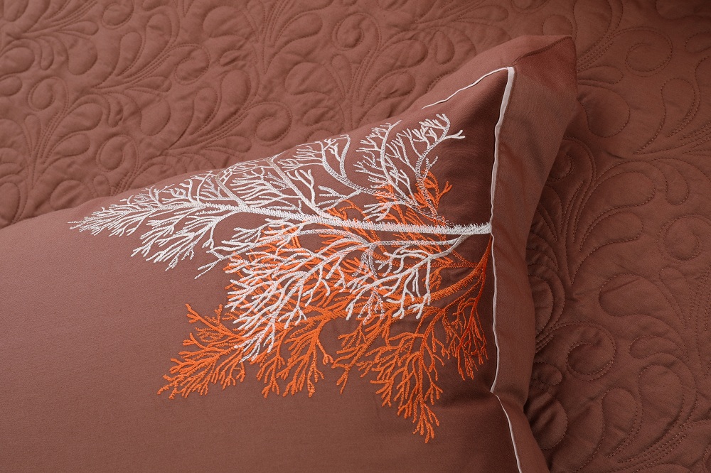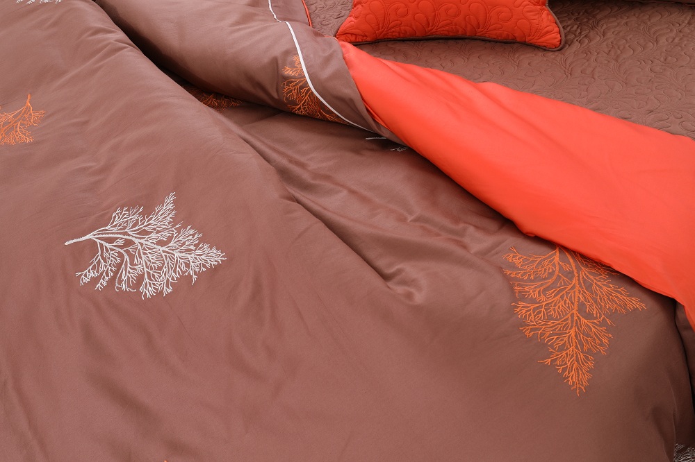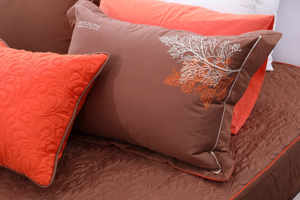 Bộ ga chun chần Hanvico My Youth – MY32 nổi bật với sắc cam tươi hòa trộn với sắc nâu trầm cùng họa tiết thêu tinh xảo tạo nên một không gian vô cùng ấm áp.