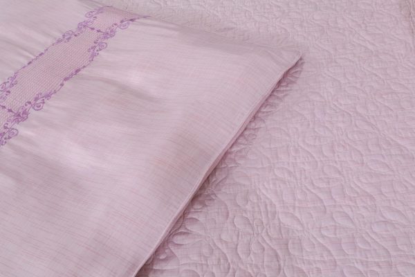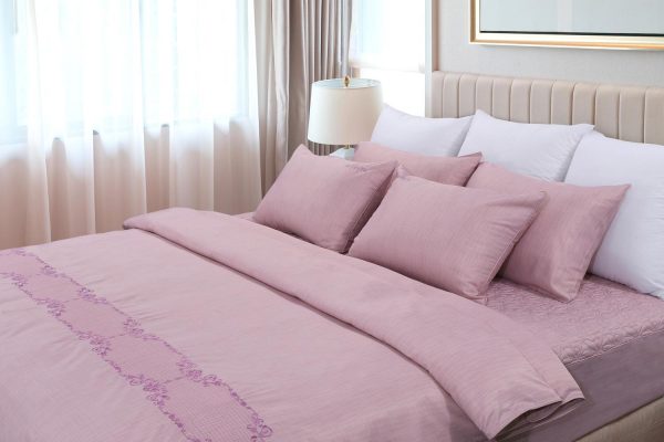 Bộ ga chun Hanvico My Youth – MY64 có sắc nude hồng kết hợp cùng dải họa tiết thêu tinh tế mang hơi hướng cổ điển giúp không gian phòng ngủ thêm tươi mới và sang trọng.