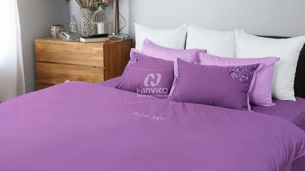 Bộ ga Hanvico phủ thêu Blue Sky – BS86 mang tím nồng nàn tô điểm họa tiết hoa lá mềm mại tinh tế như điểm thêm hương sắc, để mọi cung bậc cảm xúc được thăng hoa.
