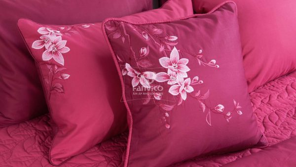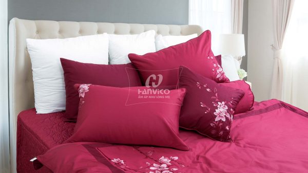 Bộ ga Hanvico phủ thêu Blue Sky – BS87 mang sắc đỏ nồng nàn tô điểm những cánh hoa mềm mại như điểm thêm hương sắc, để mọi cung bậc cảm xúc được thăng hoa.
