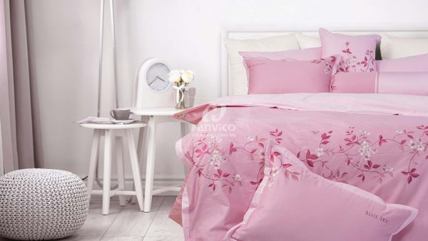 Bộ ga Hanvico phủ thêu Blue Sky – BS88 mang sắc hồng ngọt ngào và những dải hoa thêu duyên dáng.