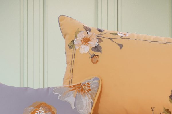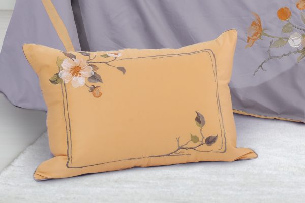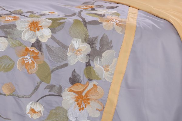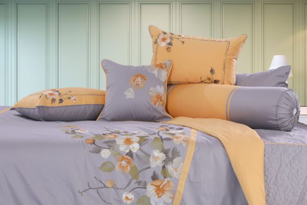 Bộ ga Hanvico phủ thêu Blue Sky – BSM70 mang sắc ghi – vàng làm nền tô điểm những cánh hoa mỏng manh, thanh thoát tạo nên một vẻ đẹp mềm mại, thanh lịch và sang trọng.