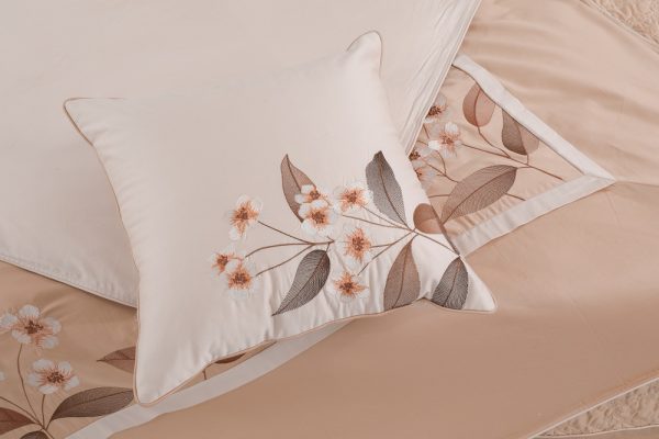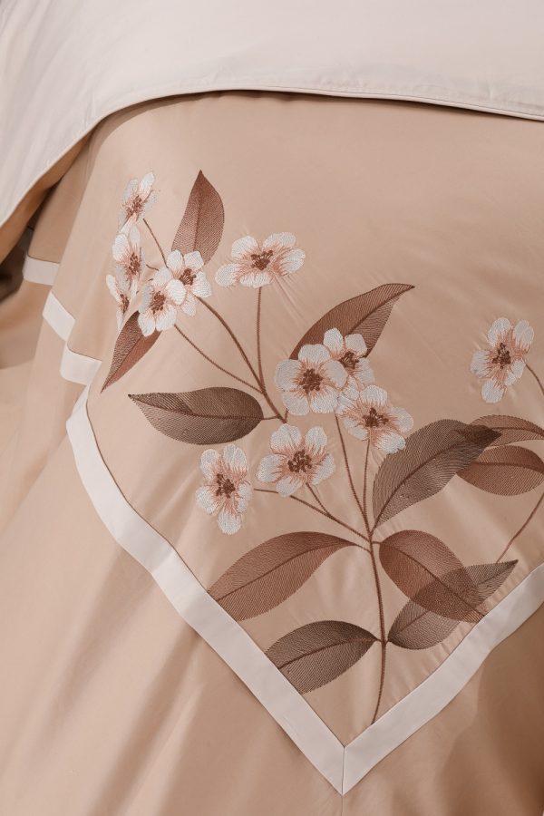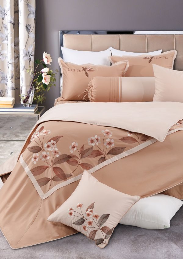 Bộ ga Hanvico phủ thêu Blue Sky – BSM78 mang sắc đỏ be nầu toát lên vẻ đẹp nền nã, sang trọng với những nhành hoa thanh thoát, mềm mại.