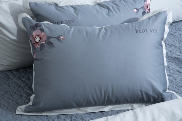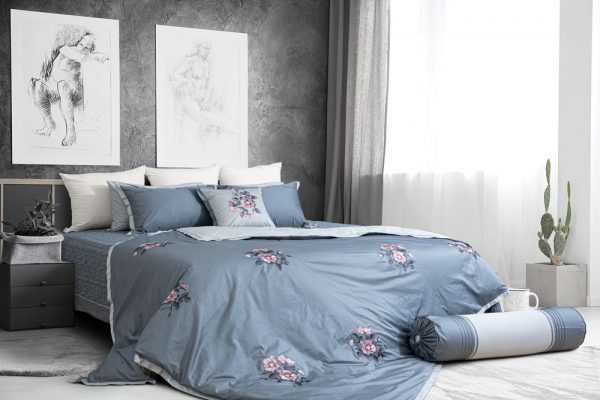 Bộ ga Hanvico phủ thêu Blue Sky - BSM92 mang gam ghi nhã nhặn trọng tô điểm họa tiết hoa nổi bật.
