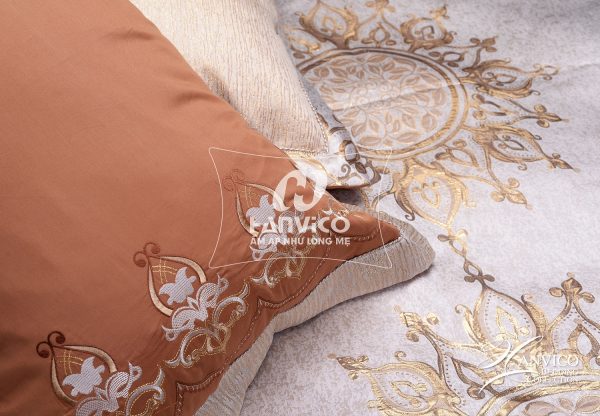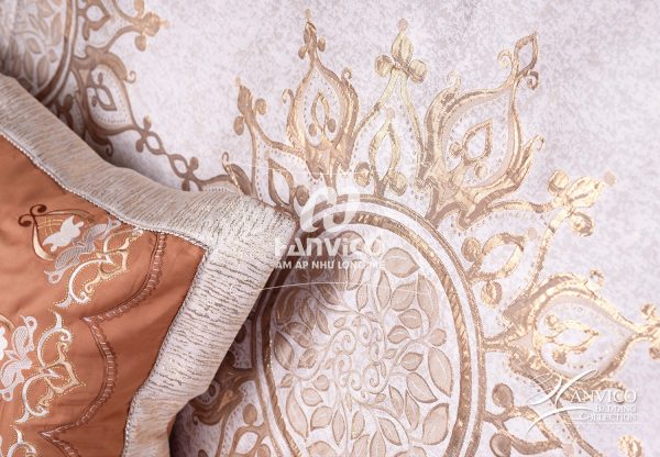Bộ ga phủ Hanvico Royal Award RA30 sử dụng công nghệ thêu cầu kỳ trên mặt vải sử dụng chỉ kim tuyết để kiến tạo nên những khối họa tiết hoa văn của Hoàng gia Anh ở thế kỷ 18 với sự kết hợp màu: vàng, nâu và kim tuyến ánh vàng càng tạo nên sang trọng mang phong cách Hoàng gia.