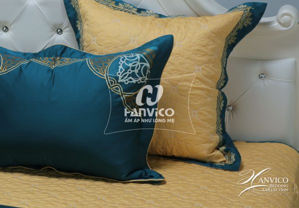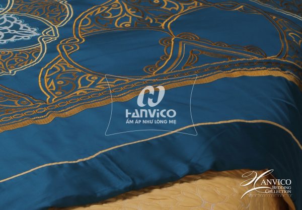 Bộ ga phủ Hanvico Royal Award RA34 sử dụng công nghệ thêu cầu kỳ trên mặt vải sử dụng chỉ kim tuyết để kiến tạo nên những khối họa tiết hoa văn luxury trên nên màu xanh cổ vịt đậm hòa quyện cùng màu vàng hoàng gia, mật độ sợi vải cao tạo nên bề mặt vải bóng mịn, kết hợp chỉ thêu kim tuyến ánh trai là điểm nhấn nổi bật của mẫu thiết kế…