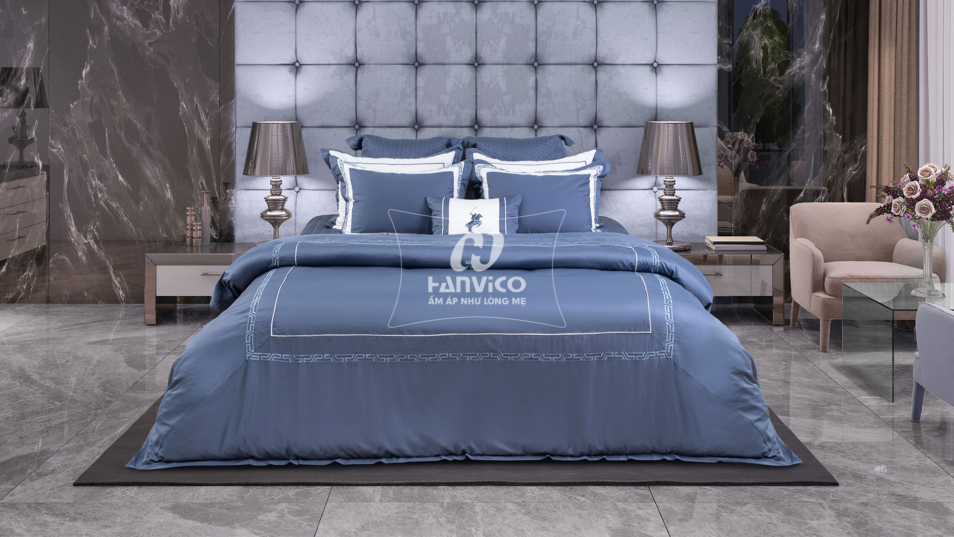 Bộ ga phủ Hanvico Royal Award RA43 mang sắc xanh xám trang nhã và những hoạ tiết cổ điển tinh xảo mang đến sự tinh tế và sang trọng cho không gian phòng ngủ.
