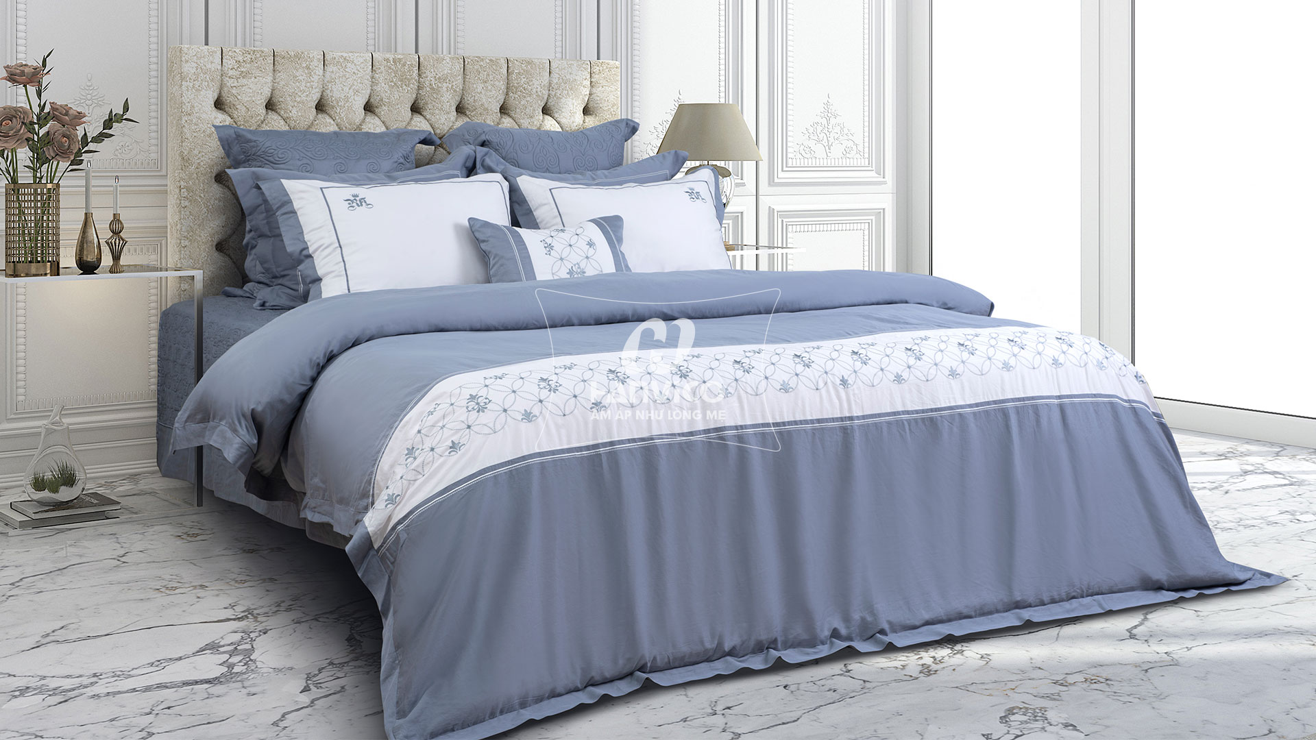 Bộ ga phủ Hanvico Royal Award RA44 là sự kết hợp giữa sắc trắng và xám trang nhã cùng những hoạ tiết tinh xảo tỉ mỉ mang đến sự tinh tế và sang trọng cho không gian phòng ngủ.