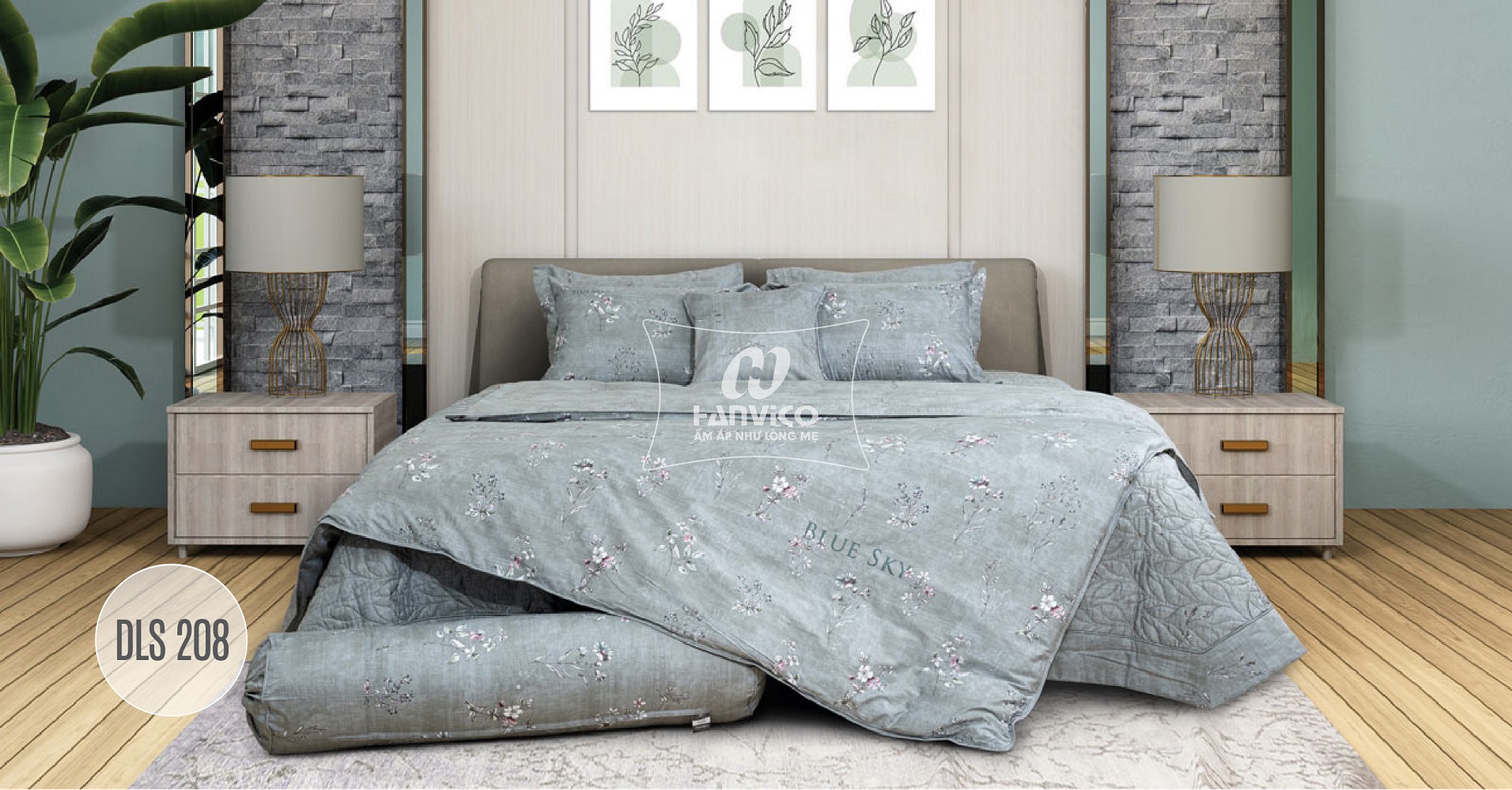 Bộ Hanvico Blue Sky Cotton T – DLS208 mang gam nhã nhặn cùng họa tiết hoa lá sinh động mang lại cảm giác sang trọng và tinh tế cho không gian phòng ngủ của bạn.