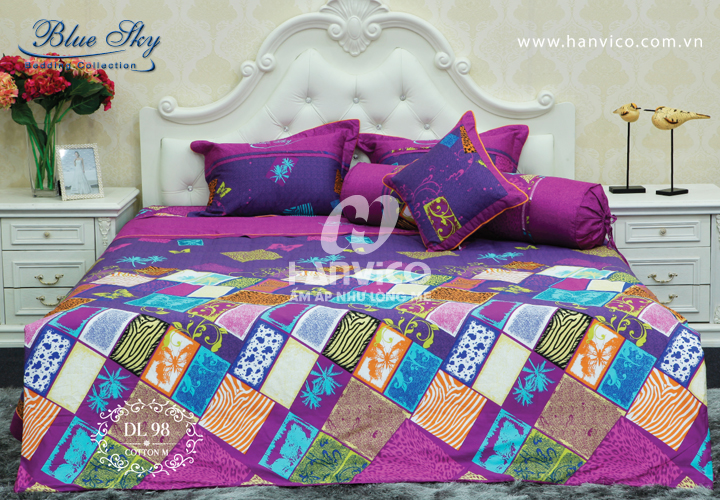 Bộ Hanvico Blue Sky CTM DL98 mang gam màu tím cùng những họa tiết cá tính tạo nét nổi bật và ấn tượng cho không gian phòng ngủ.