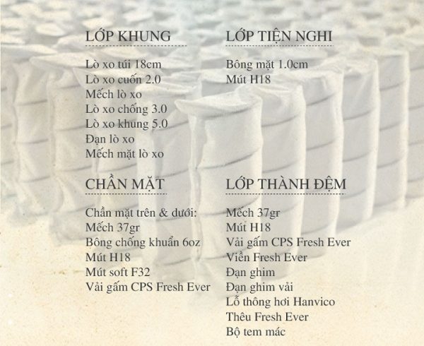 Ưu điểm nổi trội của sản phẩm là tất cả các lò xo đều được đưa vào hệ thống túi kín để đảm bảo tính kết cấu bền vững và đàn hồi hoàn toàn độc lập.